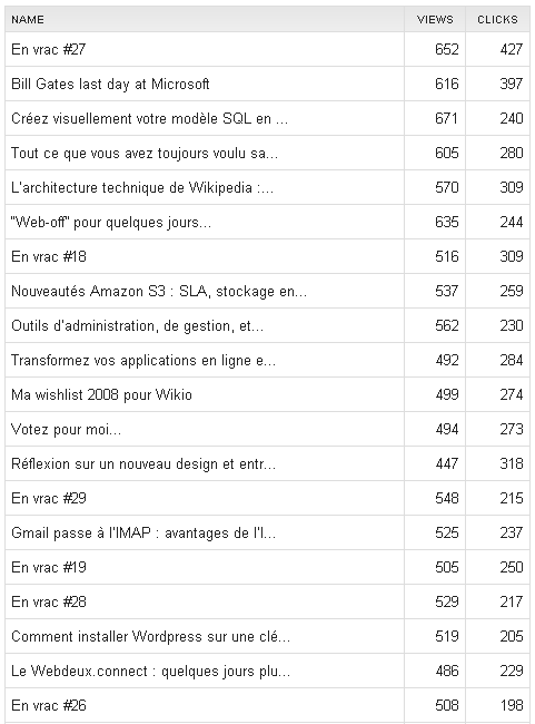 J’ai pu remarquer que la rubrique « En vrac » était de plus en plus plébiscitée par vous, lecteurs ! Cinq articles de cette catégorie sont parmis les 20 articles les plus lus au format RSS (voir image ci-dessous).